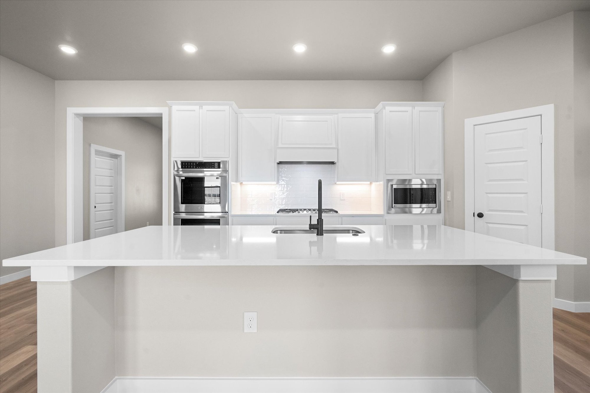 - Stainless steel appliances including a double-oven and built-in microwave cabinet