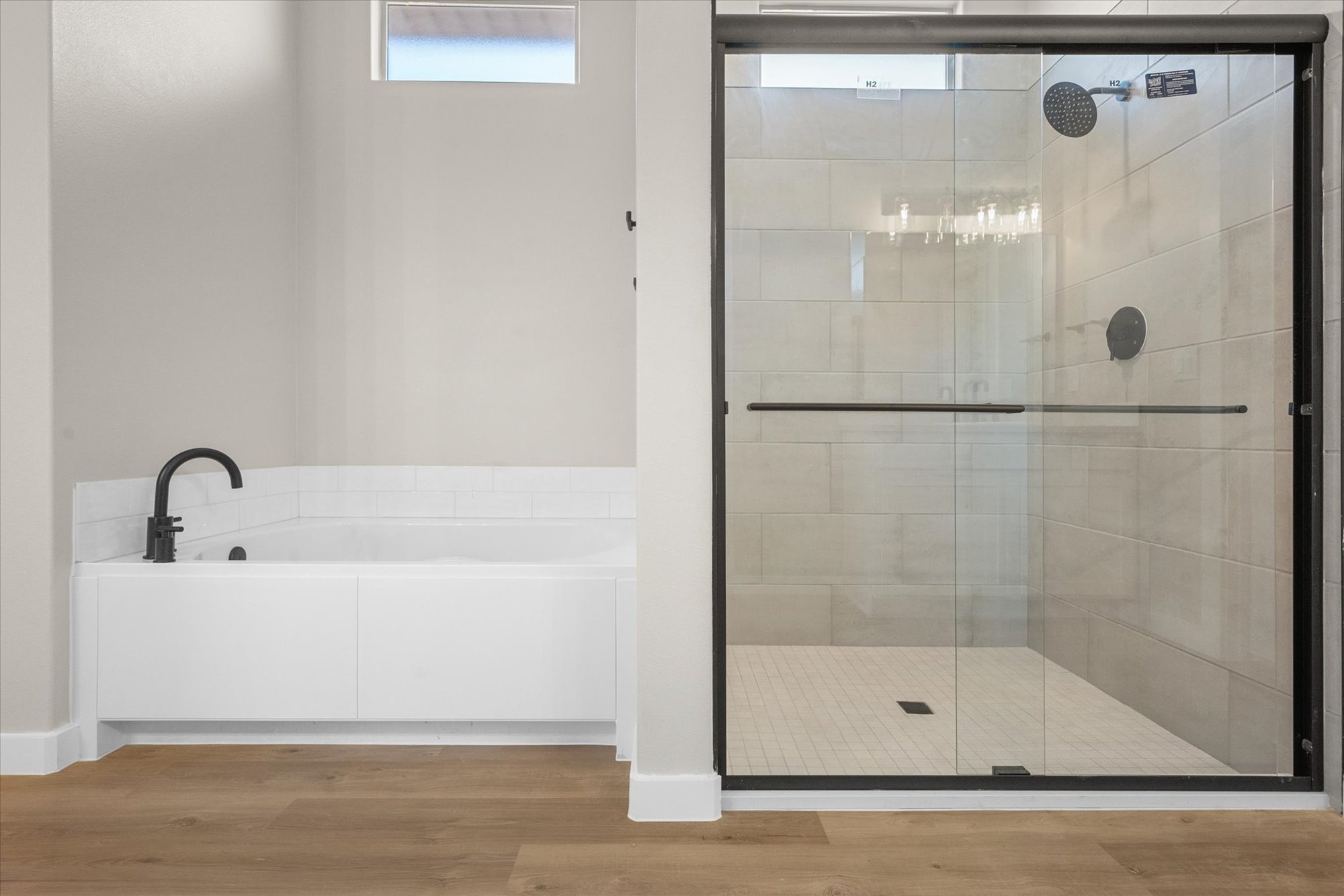 - Secluded master suite with garden tub, walk-in shower, his and hers vanities, and oversized walk-in closet with utility room access