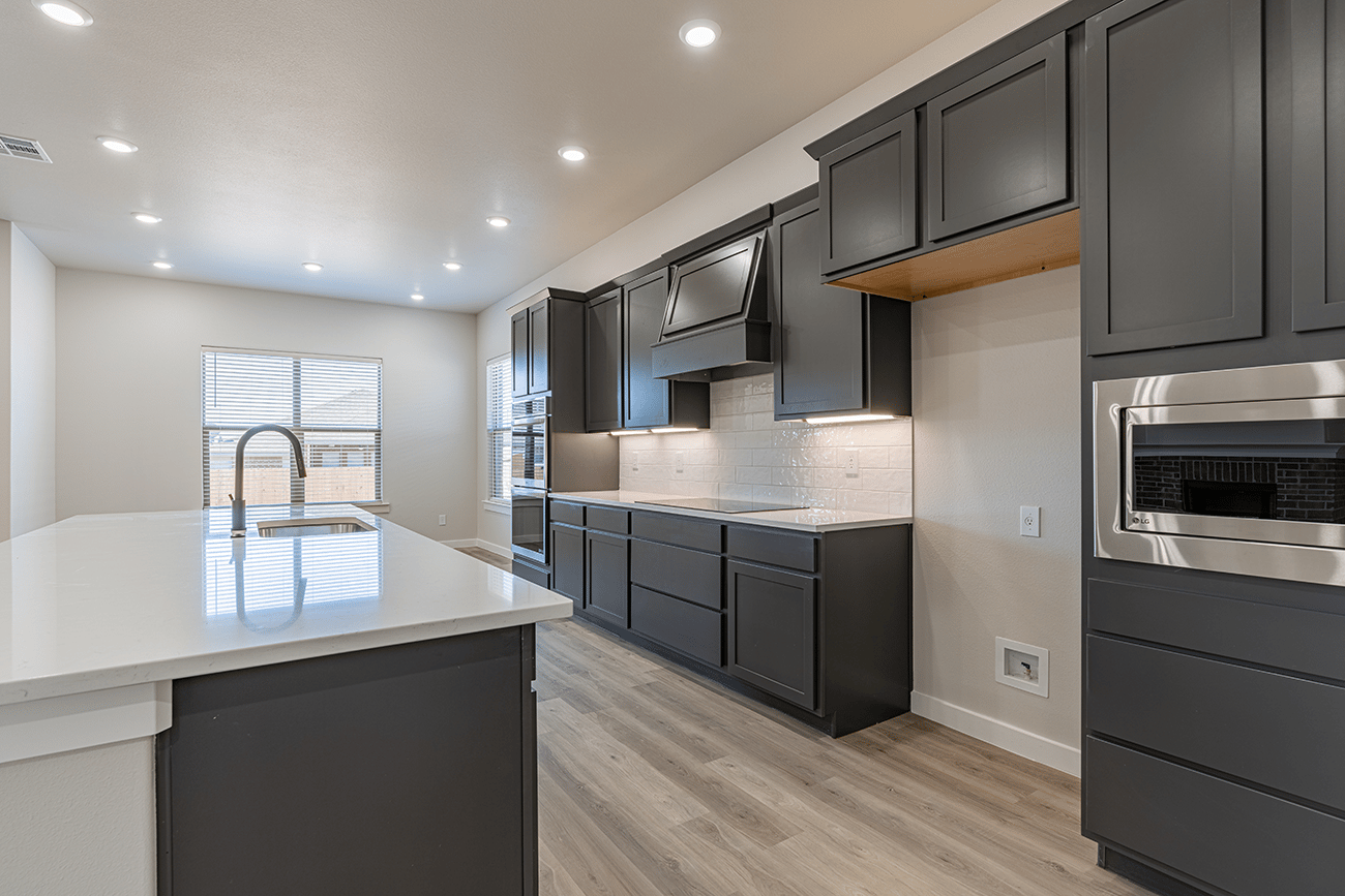- Granite or quartz countertops throughout