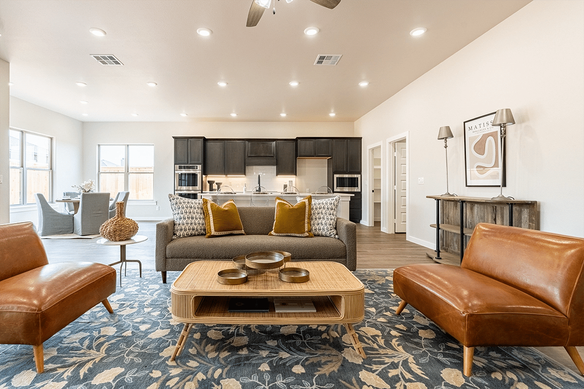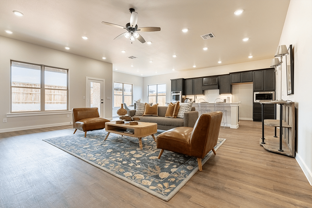 - Open-concept kitchen, living, and dining area