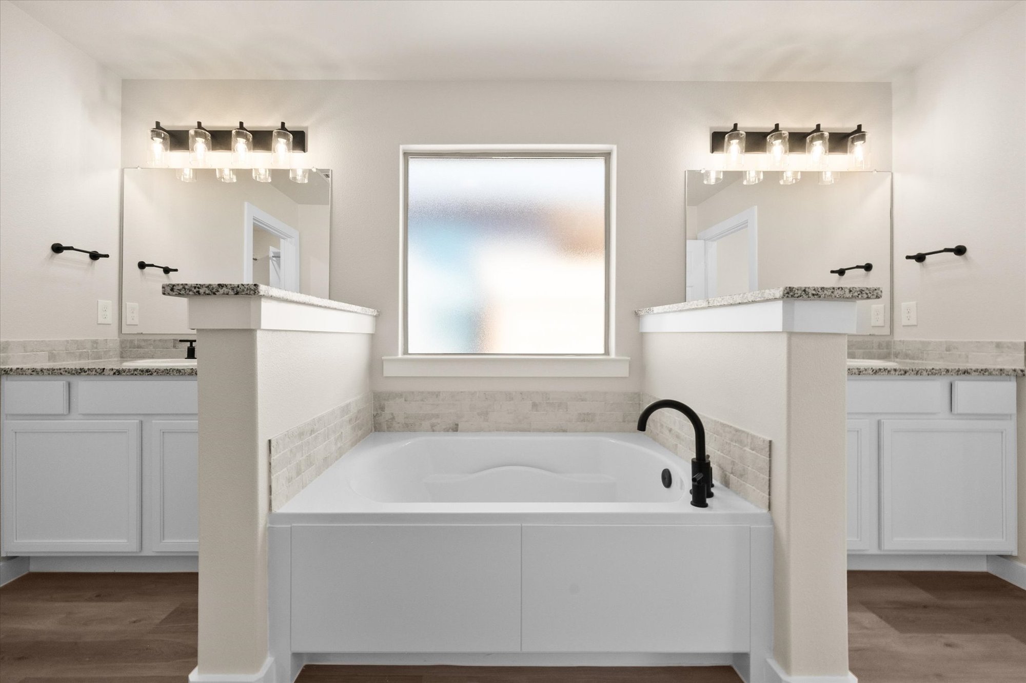 - Secluded master suite with drop-in tub, walk-in shower, his and hers vanities, and walk-in closet