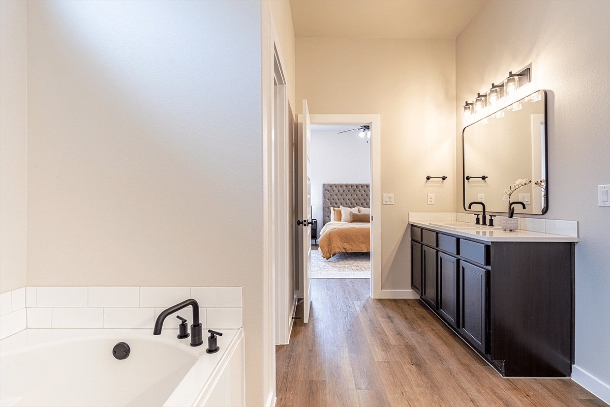 - Secluded master suite with garden tub, walk-in shower, his and hers vanities, and oversized walk-in closet