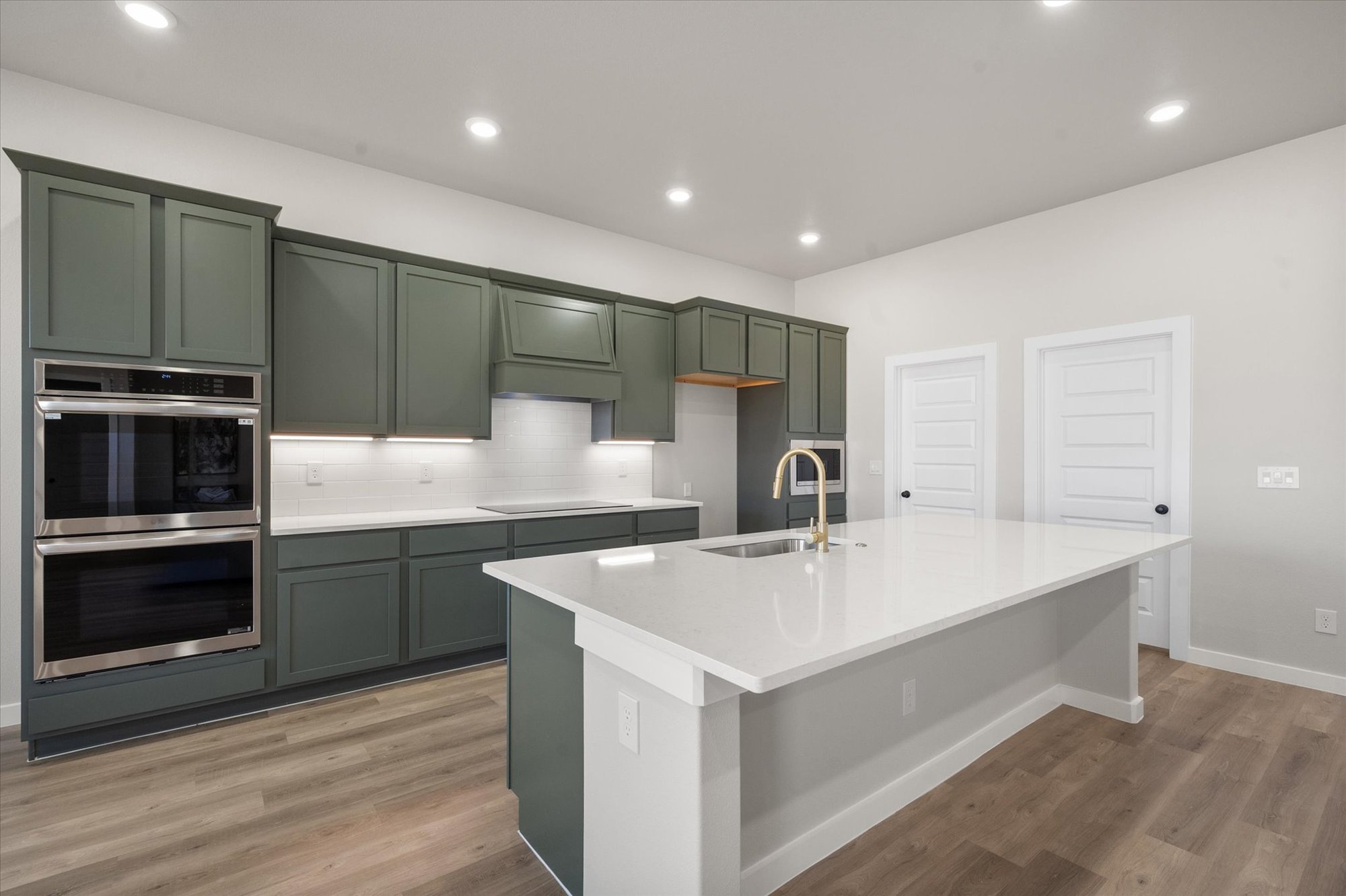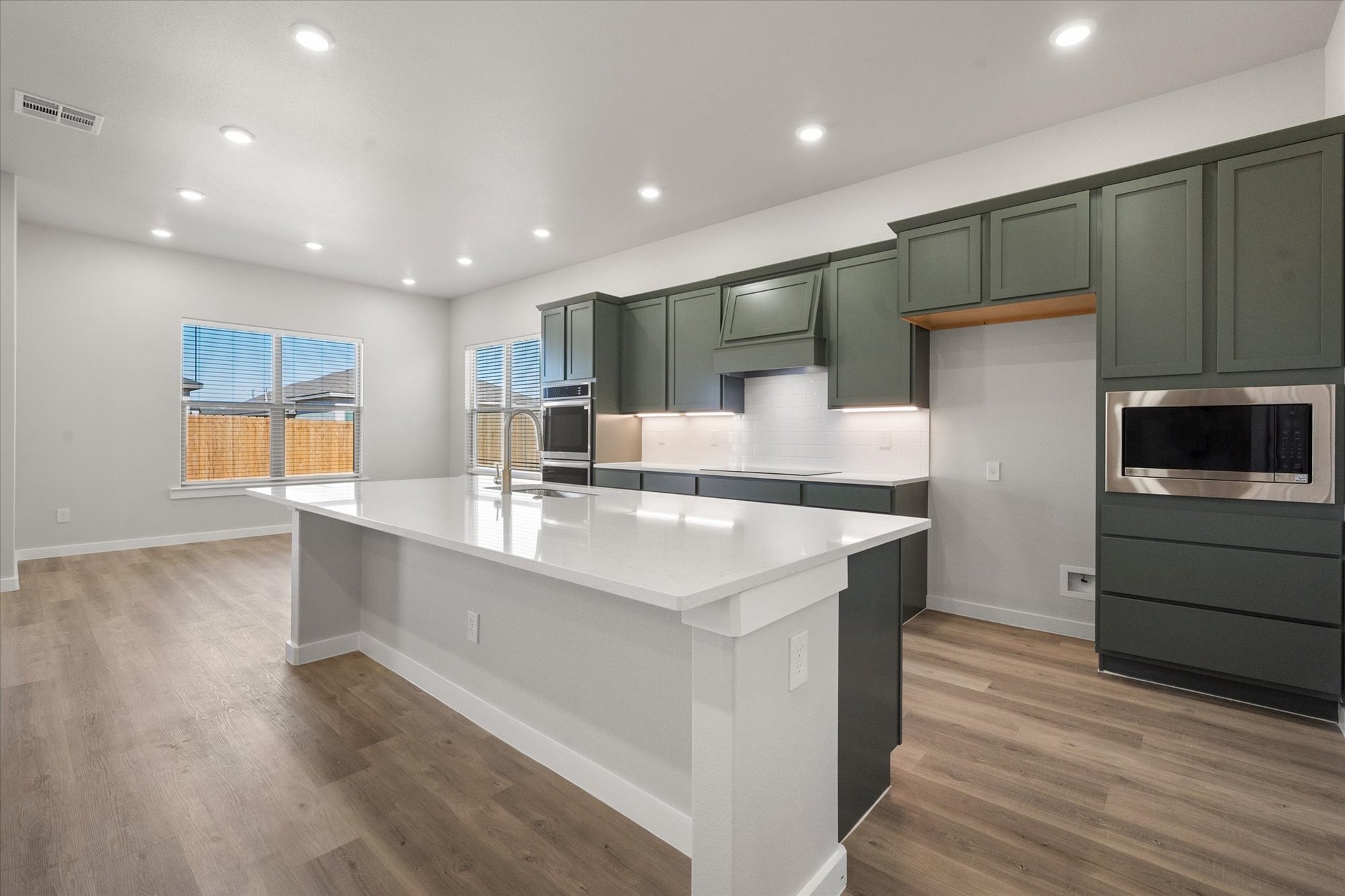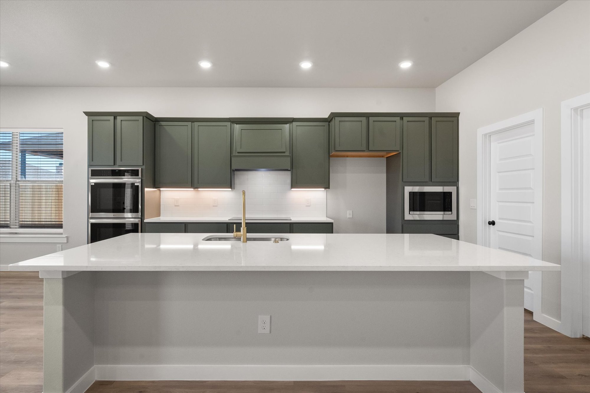 - Stainless steel appliances including a double-oven and built-in microwave cabinet