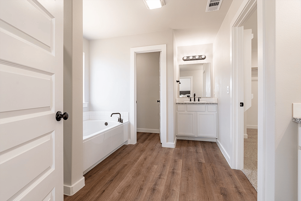- Secluded master suite with drop-in tub, walk-in shower, his and hers vanities, and walk-in closet with utility room access
