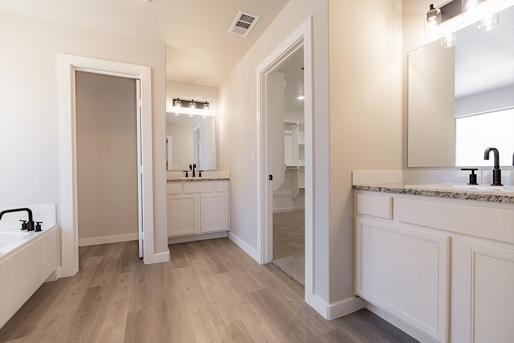 - Secluded master suite with drop-in tub, walk-in shower, his and hers vanities, and walk-in closet with utility room access